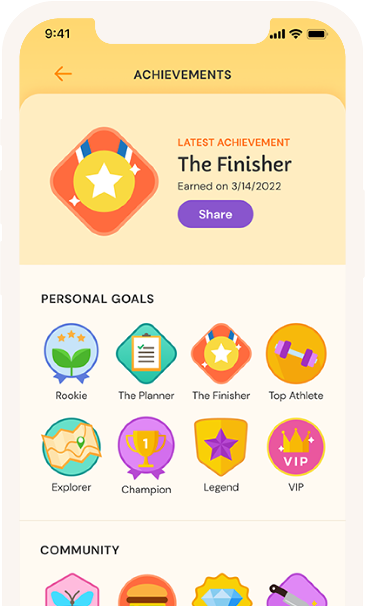 Newly designed badges will enhance the user experience by providing a lively visual language to encourage users to stay on their health paths.