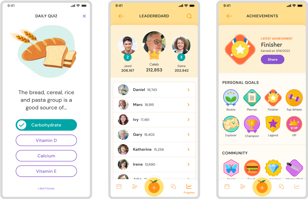 Daily quizzes, group challenges, and achievement badges create a fun environment for users to stay focused on their health goals.
